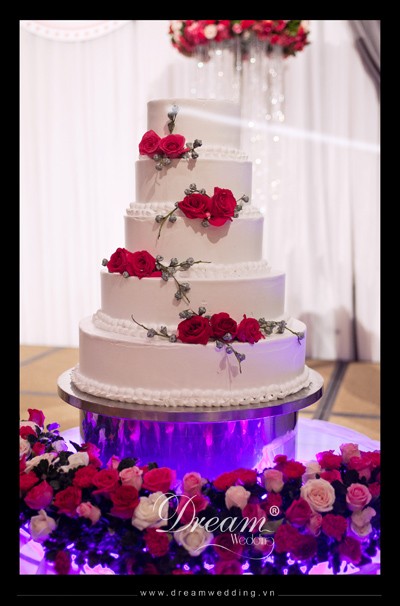 Trang trí tiệc cưới tại Nikko Hotel, trang trí đám cưới - hoa tươi trang trí bánh kem và tháp rượu