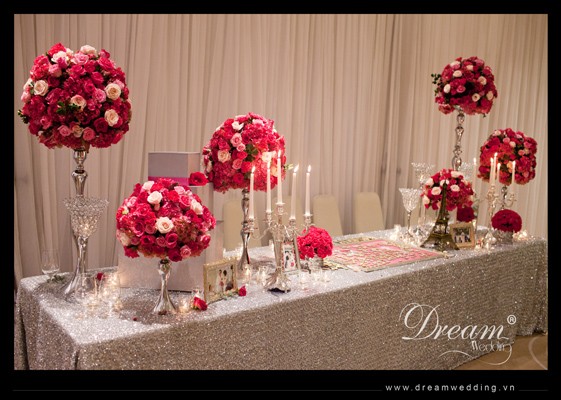 Trang trí tiệc cưới tại Nikko Hotel, trang trí đám cưới - bàn ký tên được trang trí các bình hoa tươi cao thấp và các phụ kiện đi kèm