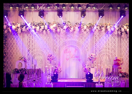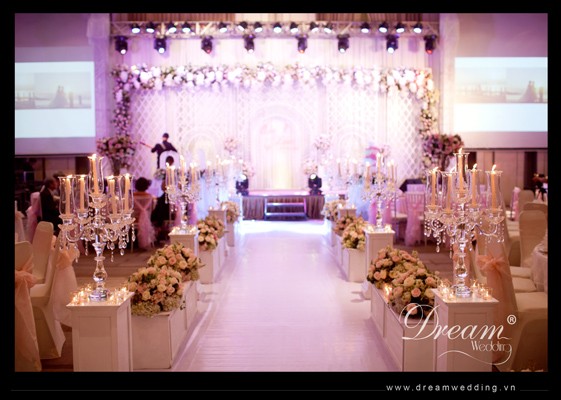 Lối đi lên sân khấu đặt trên bục và trải thảm trắng, hai bên là các chân nến pha lê đặt trên đôn gỗ, xen kẽ với các đôn hoa tươi