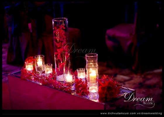 Bình thủy tinh, ly nến, hoa tưới cùng các phụ kiện được đặt trên đôn kính dọc lối lên sân khấu