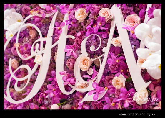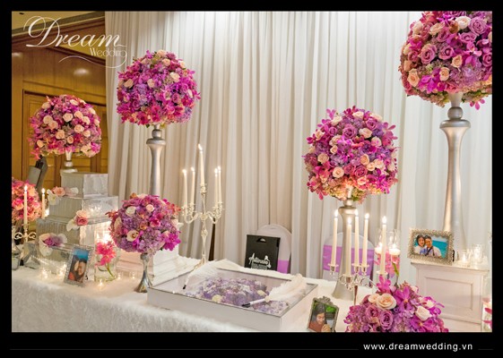 Tông màu tím hồng là tông màu chủ đạo mà Dream Wedding sử dụng trong trang trí tiệc cưới của CR Thái Hòa và CD Hồng Ngọc tổ chức tại khách sạn New World