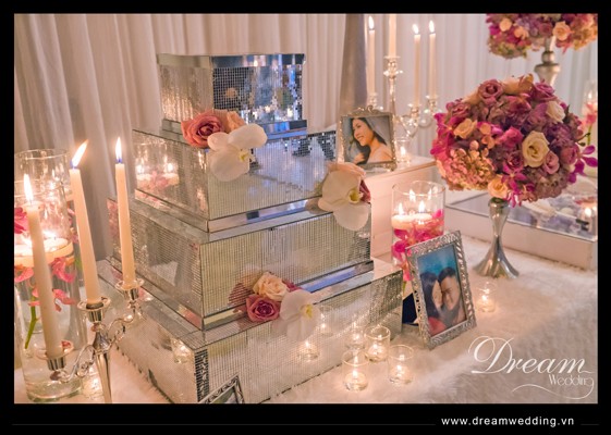 Trang trí tiệc cưới, trang trí đám cưới tại New World Hotel - thùng tiền gương màu bạc trang trí hoa tươi
