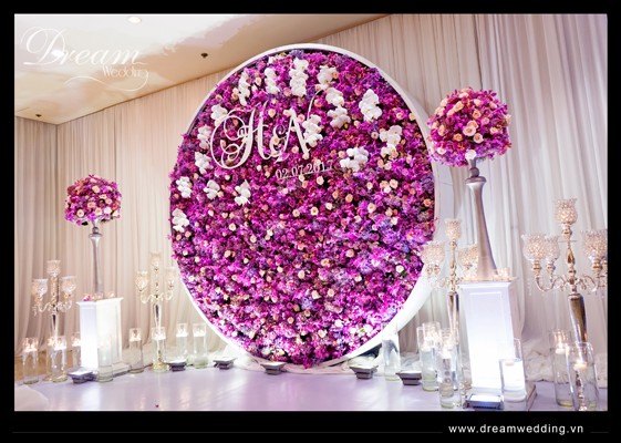 Trang trí tiệc cưới, trang trí đám cưới tại New World Hotel - phông chụp hình vòng tròn full hoa màu tím bên trong