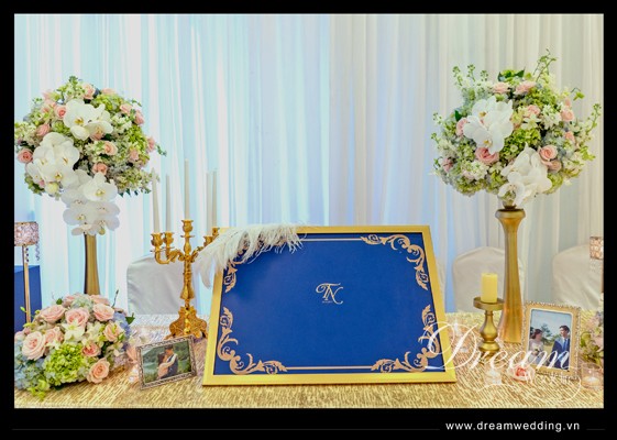 Trang trí tiệc cưới, trang trí đám cưới tại Adora Q7 - sổ ký tên với nền màu xanh biển