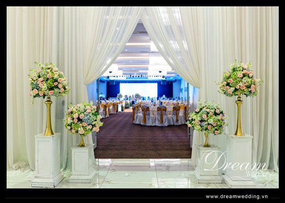 Trang trí tiệc cưới, trang trí đám cưới tại Adora Q7 - lối vào sảnh tiệc được trang trí các đôn hoa tươi cao thấp