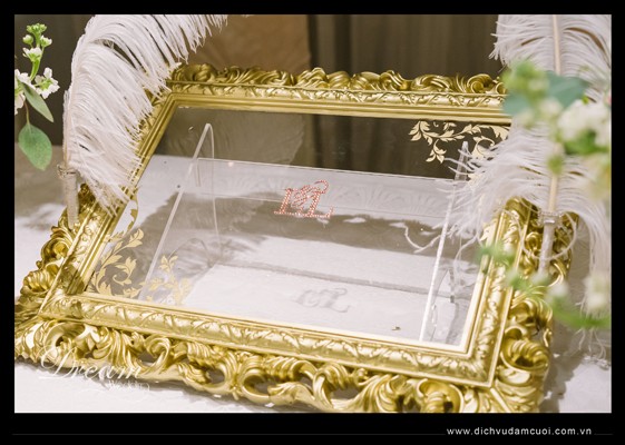 Trang trí tiệc cưới, trang trí đám cưới tại Nikko Hotel - sổ ký tên mika trong viền gỗ vàng đồng
