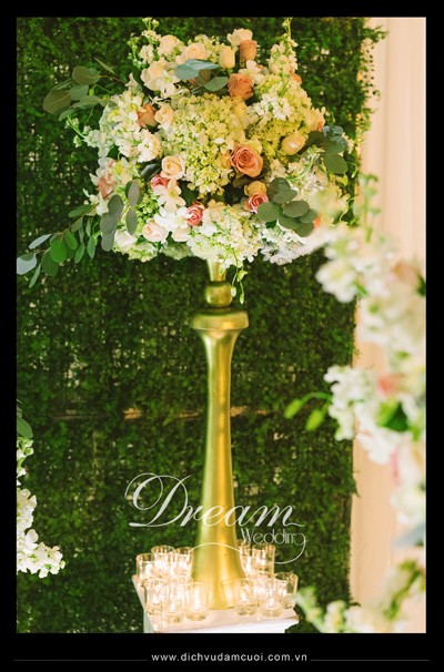 Trang trí tiệc cưới, trang trí đám cưới tại Nikko Hotel - bình hoa tươi đặt 2 bên phông chụp hình