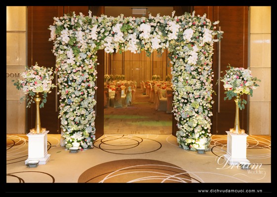 Trang trí tiệc cưới, trang trí đám cưới tại Nikko Hotel - cổng hoa tươi lớn và đôn hoa đặt phía trước cổng vào sảnh tiệc