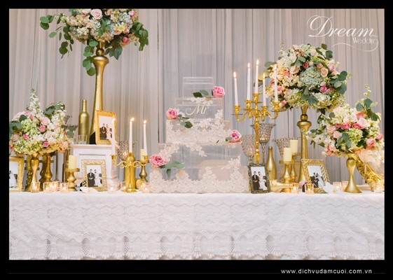 Đám cưới của CR Phước Lợi & CD Diệu Linh tổ chức tại khách sạn 5 sao Nikko được Dream Wedding thiết kế và trang trí theo tông màu chủ đạo là trắng, hồng pastel, xanh cốm kết hợp với các phụ kiện vàng đồng