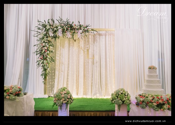 Trang trí tiệc cưới, trang trí đám cưới tại Nikko Hotel - sân khấu là khung gỗ trang trí hoa đơn giản, bánh kem tháp rượu cũng được viền hoa tươi phía dươi