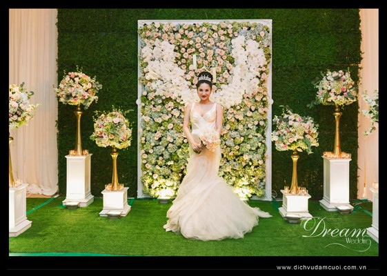 Trang trí tiệc cưới, trang trí đám cưới tại Nikko Hotel - phông chụp hình nền xanh phía sau, chính giữa là phông hoa tươi