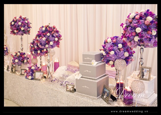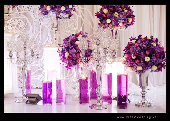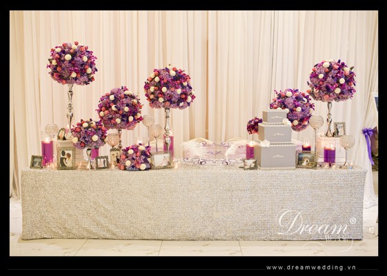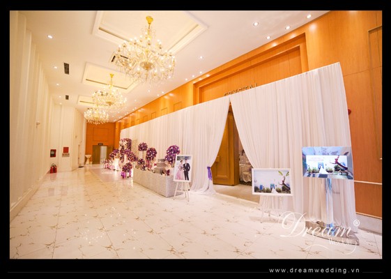 Tông tím, hồng đậm, hồng nhạt kết hợp với màu trắng là tông màu được Dream Wedding kết hợp trong trang trí tiệc của Minh Huy & Mỹ Yến tổ chức tại trung tầm hội nghị tiệc cưới The Adora (Ngô Gia Tự - Q.5). Mời các bạn tham khảo 1 số hình trang trí tiệc cưới của anh chị từ khu vực đón khách cho đến lối đi, sân khấu:
