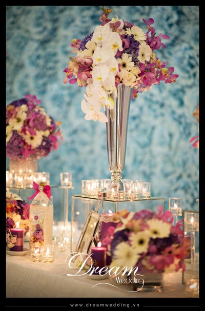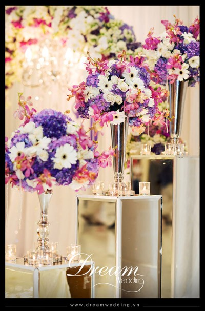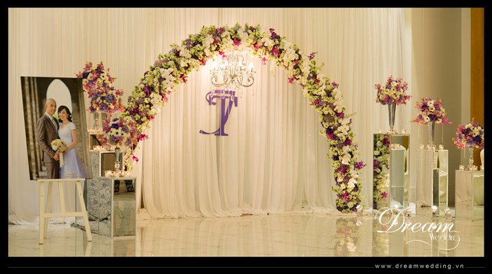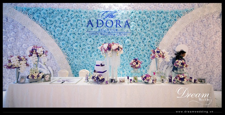 Đám cưới Thức & Thy tổ chức tại trung tân hội nghị tiệc cưới Adora Ngô Gia Tự được Dream Wedding trang trí theo tông màu chủ đạo là tím hồng kết hợp với màu trắng. Sau đây là những hình ảnh trang trí trong đám cưới: