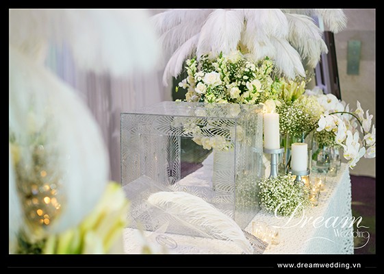 Tông màu trắng của các loại hoa tươi kết hợp với chất liệu alu gương được Dream Wedding thiết kế trong đám cưới của CR Nhật Minh & Minh Anh) tổ chức tại nhà hàng tiệc cưới Gem Center. Sau đây là những hình ảnh đẹp trong đám cưới anh chị, mời mọi người tham khảo: