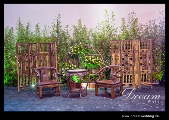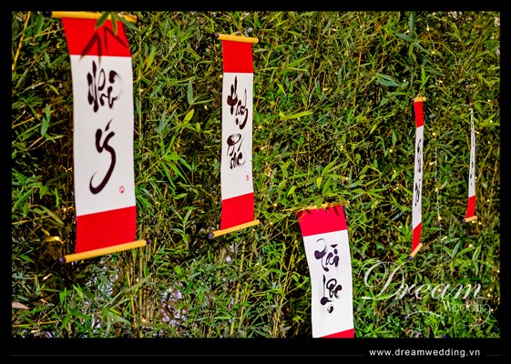 Trang trí tiệc sinh nhật, trang trí tiệc cưới, trang trí đám cưới tại Gem Center - chữ thư pháp treo trên các hàng tre