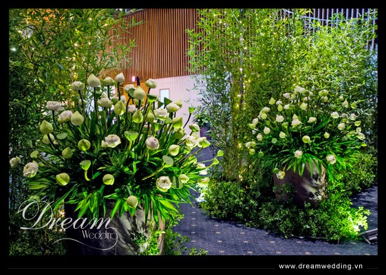 Trang trí tiệc sinh nhật, trang trí tiệc cưới, trang trí đám cưới tại Gem Center - phông chụp hình với nền lá xanh phía sau, phía trước là các bình hoa sen cao thấp