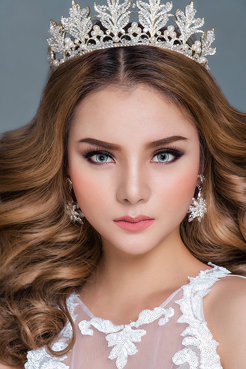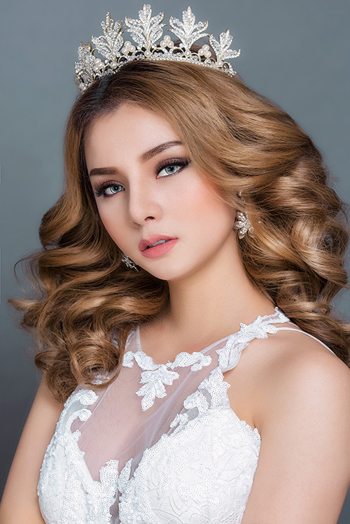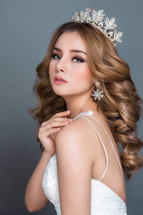 Chuyên gia trang điểm kẻ dáng lông mày khuôn to và sử dụng phấn má màu nâu, kéo xéo về phía mang tai giúp khuôn mặt thon gọn. Mái tóc cô dâu được uốn bồng bênh với kiểu xoăn lọn to. Tô điểm cho mái tóc ngày cưới là chiếc vương miện đính đá lấp lánh.