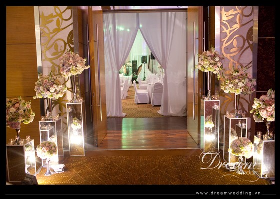Cổng lối vào sảnh tiệc cũng được trang trí các đôn hoa tươi cao thấp đặt trên các đôn kính