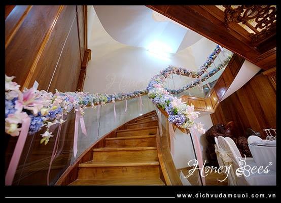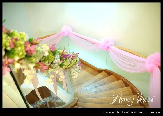 Trang trí lễ ăn hỏi nhà gái - trang trí hoa tươi dọc 2 bên cầu thang