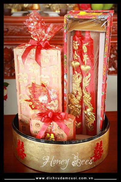 Trang trí lễ đính hôn nhà gái - mâm quả trà, rượu, đèn nhà trai mang sang