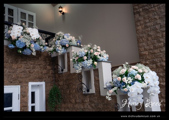 Trang trí lễ gia tiên, trang trí lễ vu quy, trang trí lễ đính hôn - cổng hoa tươi với sự kết hợp của các tông màu xanh biển, hồng pastel và trắng