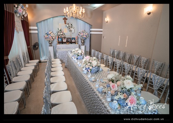 Tông màu xanh biển, hồng pastel, trắng kết hợp với màu bạc của các phụ kiện khăn bàn, nơ ghế được Honey Bees thiết kế và trang trí trong lễ đính hôn của CD Quỳnh Hương & CR Tuấn Anh