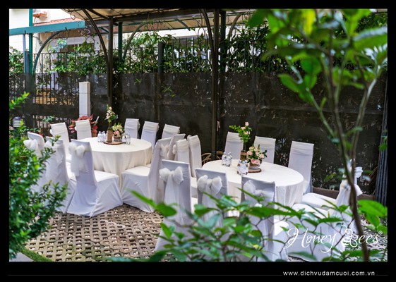 Trang trí lễ đính hôn, trang trí lễ gia tiên - bàn tròn ghế niệm đặt nơi sân vườn