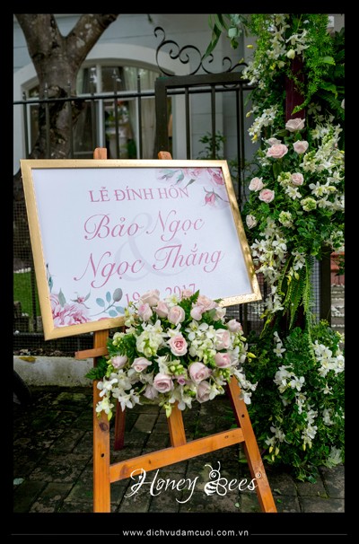Trang trí lễ đính hôn, trang trí lễ gia tiên - bảng thông tin trang trí hoa tươi đặt phía trước