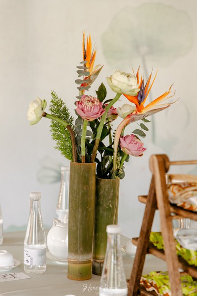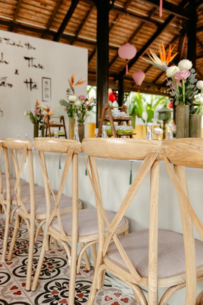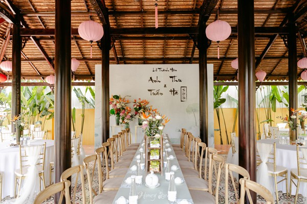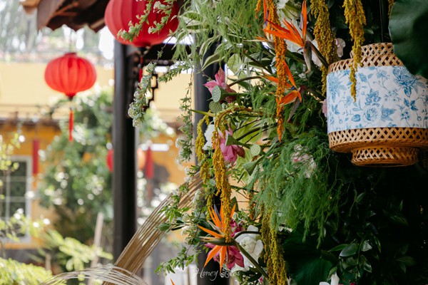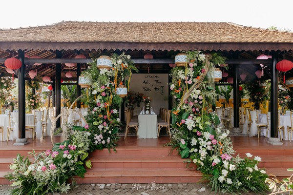 Với sự cổ kính từ kiến trúc tại khu vườn nhà chú rể, từng chi tiết trong buổi lễ được Honey Bees ngụ ý thiết bằng sự tỉ mỉ và tinh tế nhất định khi kết hợp giữa vẻ đẹp truyền thống từ hai màu hoa sen - trắng & hồng cùng những chất liệu thân thuộc với con người Việt Nam như mành cối, mây, tre … đã làm cho tổng thể không gian tư gia được hài hoà và ấm áp hơn. Đặc biệt, Lễ Thành Hôn của Tuấn & Hà còn trở nên sinh động hơn khi được tô điểm thêm những loài hoa lá mang sắc màu tươi mới như thiên điểu, hồng, lyly, cúc mẫu đơn … như một cách để làm nổi bật được những nét đẹp của nền văn hoá Việt.