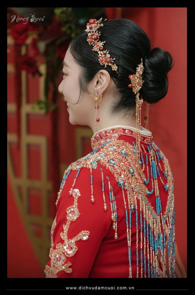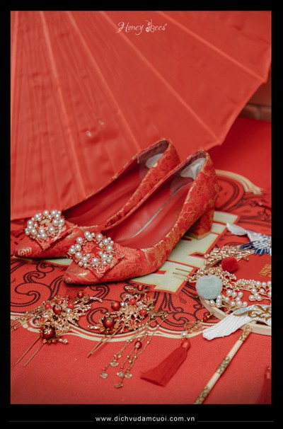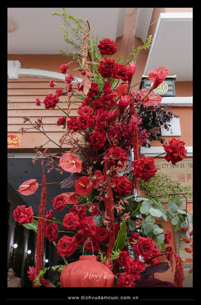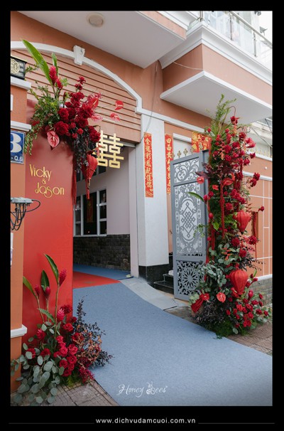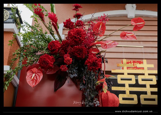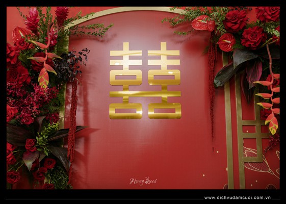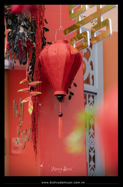 Một vẻ đẹp tinh hoa, lãng mạn đến từ tone màu đỏ rực rỡ Trung Hoa và lồng đèn đỏ Hội An của Việt Nam được Honey Bees khéo léo trang trí đồng bộ xuyên suốt buổi lễ, thể hiện nền văn hoá của 2 đất nước của cô dâu và chú rể. Đây không chỉ là tone màu quen thuộc trong các hôn lễ của người Hoa, mà đó còn được xem là màu của sự nồng nàn và một tình yêu mãnh liệt.