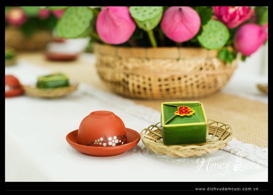 Chi tiết nhỏ mang đậm chất cổ truyền xưa là bộ tách trà được đặt kế bên chiếc bánh phu thê nằm trên rế tre nhỏ