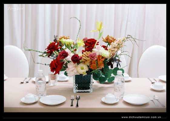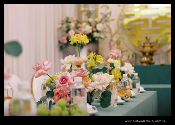 Không gian buổi lễ được kết hợp đan xen các tone màu như đỏ, vàng, hồng, trắng, cam,… từ những đoá hoa hồng đang đua nhau khoe sắc như thể hiện chặn đường yêu đầy kiên cường của Thức & Ngọc khi cả hai vượt qua những khó khăn để có một cái kết thật đẹp như vậy. Bên cạnh đó, mỗi hạng mục, mỗi chi tiết trong buổi lễ đều được Honey Bees cẩn thận và chăm chút thật tinh tế để góp phần tạo nên không gian lãng mạn và ấm cúng nhưng không kém phần trẻ trung và hiện đại. Một không gian như mở ra cuộc hành trình mới đánh dấu thời khắc cả hai chính thức trở thành mảnh ghép cuối cùng của nhau dưới sự chứng kiến của hai bên gia đình và các vị khách quý.