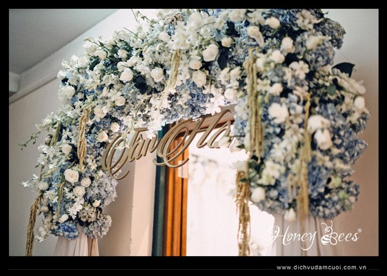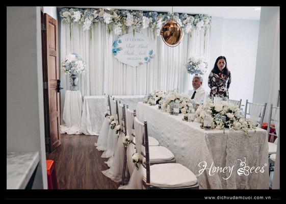 Đám cưới của CR Nhật Minh & CD Minh Anh tổ chức tại tư gia được Honey Bees thiết kế và trang trí - nhà trai theo tông màu chủ đạo là trắng kết hợp xanh biển, nhà gái theo tông màu trắng vàng đồng. Sau đây là những hình ảnh trong trang trí lễ gia tiên của nhà CR & CD