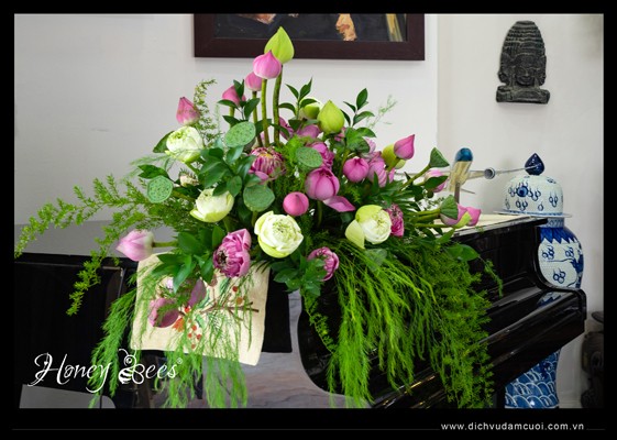 Trang trí lễ gia tiên theo chủ đề hoa sen, trang trí lễ vu quy - hoa sen trang trí trên đàn piano