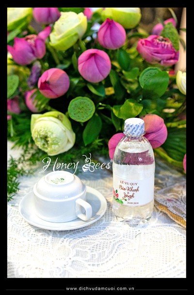 Trang trí lễ gia tiên theo chủ đề hoa sen, trang trí lễ vu quy - nước suối được thiết kế riêng và ly tách trên bàn họ