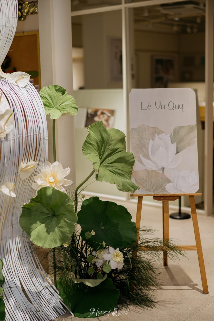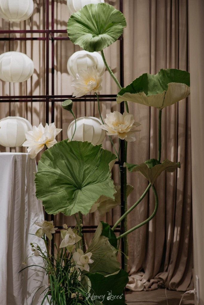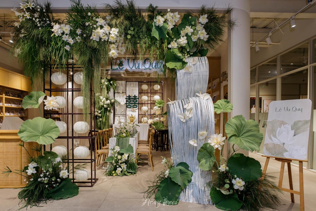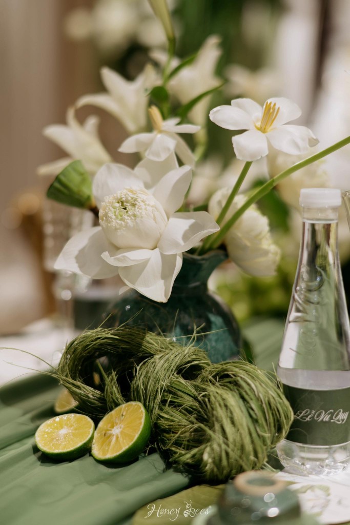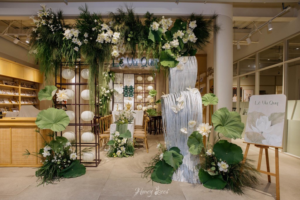 Thu hút những nàng dâu có niềm đam mê hoa sen bất tận, Honey Bees quyết định tạo ra một không gian mang âm hưởng từ nét đẹp Á Đông - mộc mạc mà trang nghiêm, tỉ mỉ nhưng vô cùng tinh tế. Ngoài ra, với ý nghĩa đặc biệt mà không loài hoa nào có được, ngoài sự biểu đạt của một tình yêu thuần khiết thì những cành sen tinh khôi còn tượng trưng cho sự vươn lên từ thử thách, là lời hứa hẹn vẹn tròn cho những ngày tháng mà đôi trẻ cùng nhau đi qua. Và đó chính là minh chứng rõ nét cho sự sáng tạo trong nghệ thuật thiết kế của Honey Bees về một không gian đầy ắp ý nghĩa về những giá trị văn hoá của quê hương, đất nước.