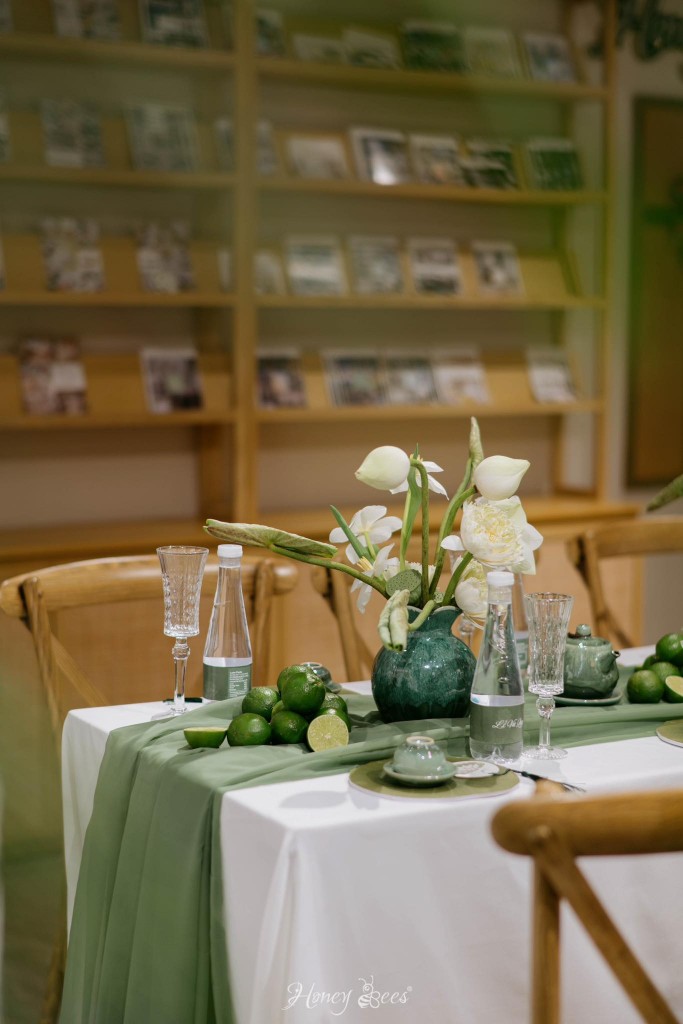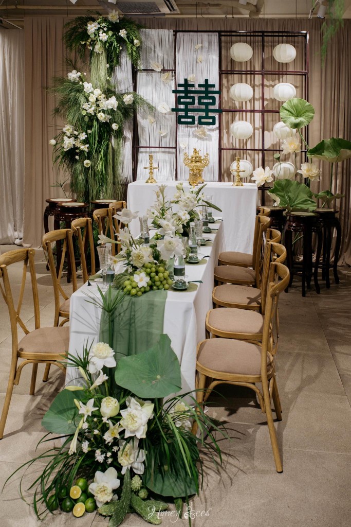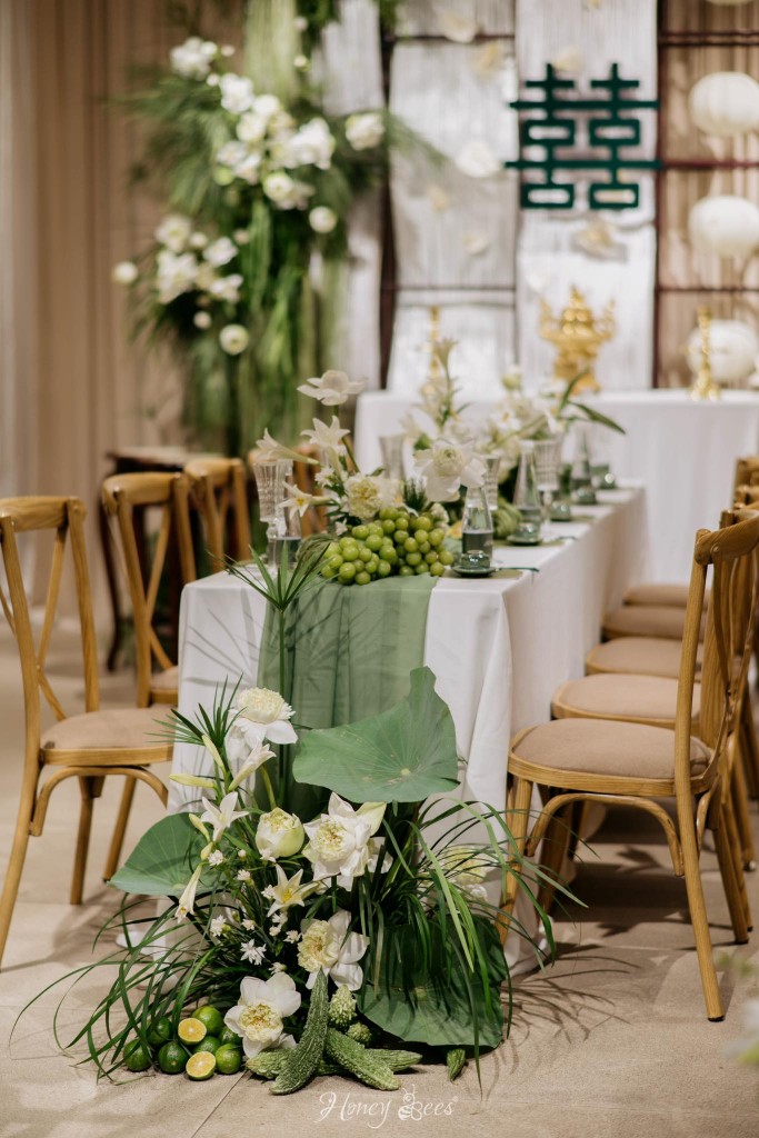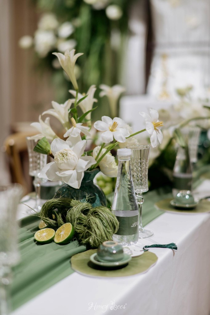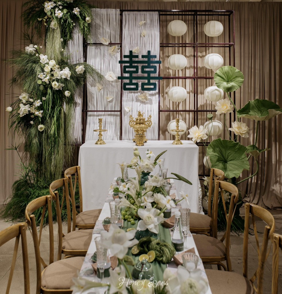 Thu hút những nàng dâu có niềm đam mê hoa sen bất tận, Honey Bees quyết định tạo ra một không gian mang âm hưởng từ nét đẹp Á Đông - mộc mạc mà trang nghiêm, tỉ mỉ nhưng vô cùng tinh tế. Ngoài ra, với ý nghĩa đặc biệt mà không loài hoa nào có được, ngoài sự biểu đạt của một tình yêu thuần khiết thì những cành sen tinh khôi còn tượng trưng cho sự vươn lên từ thử thách, là lời hứa hẹn vẹn tròn cho những ngày tháng mà đôi trẻ cùng nhau đi qua. Và đó chính là minh chứng rõ nét cho sự sáng tạo trong nghệ thuật thiết kế của Honey Bees về một không gian đầy ắp ý nghĩa về những giá trị văn hoá của quê hương, đất nước.