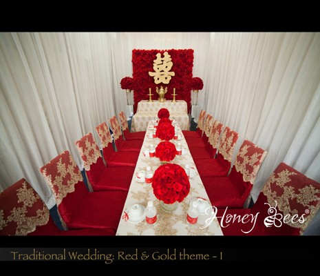 Bao ghế, khăn bàn với màu vàng đồng kết hợp với hoa tươi, phông bàn thờ màu đỏ