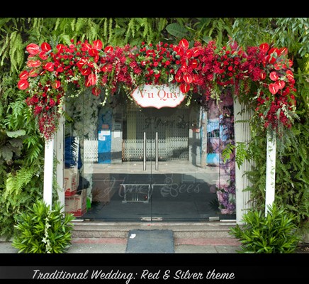 Cổng hoa tươi bên ngoài với lá dưới chân, bên trên là vòm hoa tươi màu đỏ của các loại hoa tươi