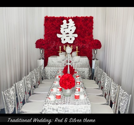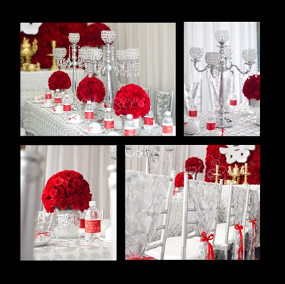 Các bình hoa đỏ, nơ ghế, tách trà, chai nước được trang trí với màu đỏ tươi