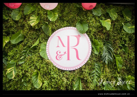 Trang trí nhà lễ gia tiên (lễ vu quy) - logo viết tắt tên CD & CR được treo trên phông lá