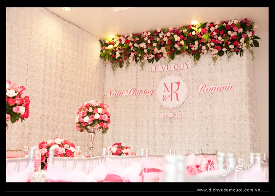 Trang trí nhà lễ gia tiên (lễ vu quy) - phông hoa tươi và tên CD & CR