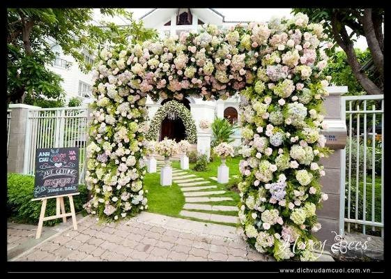 Cửa ra vào bên ngoài là cổng hoa tươi lớn đầy hoa với hoa tú cầu, hồng pastel và lá xen kẽ nhau