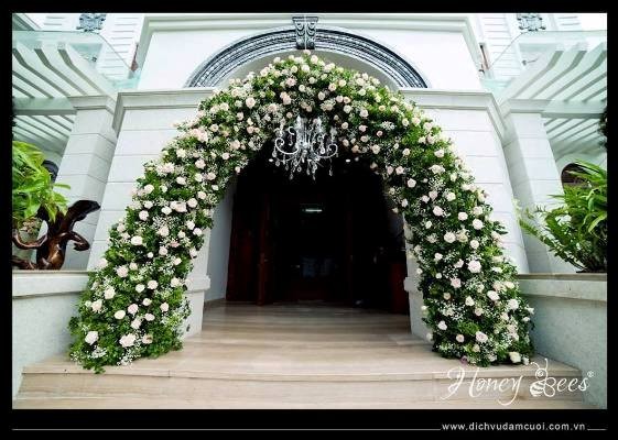 Trước của nhà phía trong là cổng hoa tươi với lá xanh làm nền chủ đạo được đính hoa pipi trắng và hoa hồng