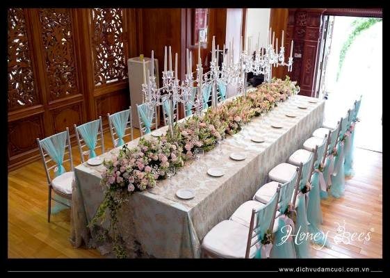 Bàn 2 họ được trang trí theo dãi dài 2 bên với dãi hoa tươi ở giữa xen kẽ với những chân nến pha lê lung linh