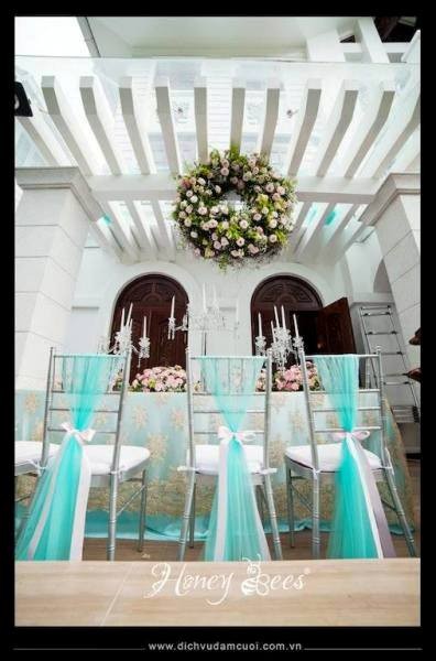 Đến với đính hôn của Ngân Hà, Honey Bees trang trí tông màu chủ đạo là xanh mint và hồng pastel, nhưng khác lạ hơn mọi lần bởi cách sử dụng lá và hoa, cây khô mộc mạc, tự nhiên. Với sự kết hợp những trụ đèn pha lê, ren trải bàn theo phong cách cổ điển màu vàng đồng đã làm cho không gian ngôi nhà trở nên sang trọng và lộng lẫy hơn.