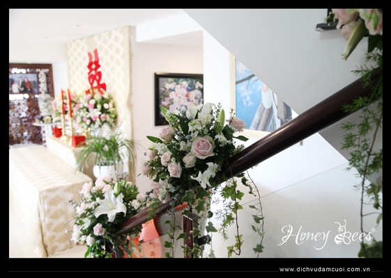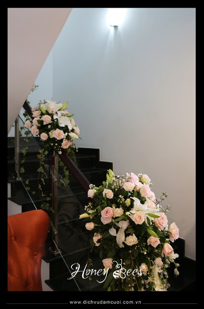 Trang trí nhà lễ gia tiên, trang trí lễ vu quy - hoa tươi trang trí trên cầu thang