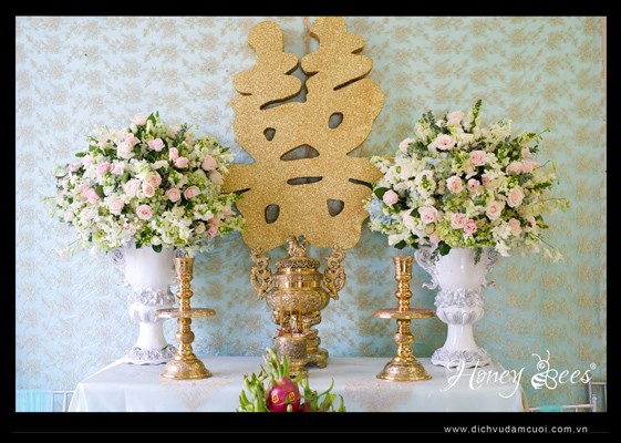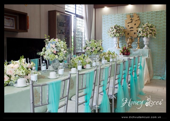 Được sự tin tưởng của giá đình và anh, chị - Tuấn Khương & Phương Vy trong việc tổ chức cũng như trang trí đám cưới từ trang trí lễ gia tiên cho đến nhà hàng. Sau đây Honey Bees xin giới thiệu 1 số hình ảnh bên công ty đã thực hiện trong trang trí lễ gia tiên tại nhà chú rễ Tuấn Khương theo tông màu chủ đạo là xanh mint đi kèm với màu vàng đồng của các phụ kiện đi kèm.