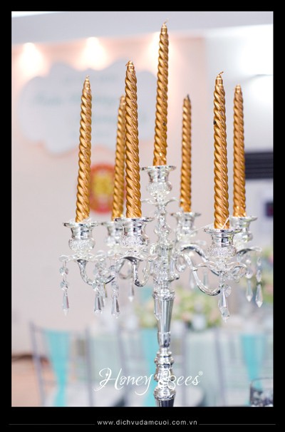 Bàn 2 họ đặt các chân nến cắm nến màu vàng đặt xen kẽ với hoa tươi