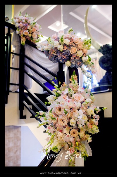 Cầu thang khi nhìn từ trên cao xuống được trang trí các cụm hoa tươi xen kẻ, cách khoảng với nhau